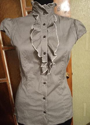 очень красивая блуза, приталенного силуэта, качественная, натуральная ткань, немного тянется. пол обхват груди -44, талия-36, низ-46, ш спинки-34, длина -60, воротничок стойка, застежка на пуговицы, украшенная воланом, удачных покупок