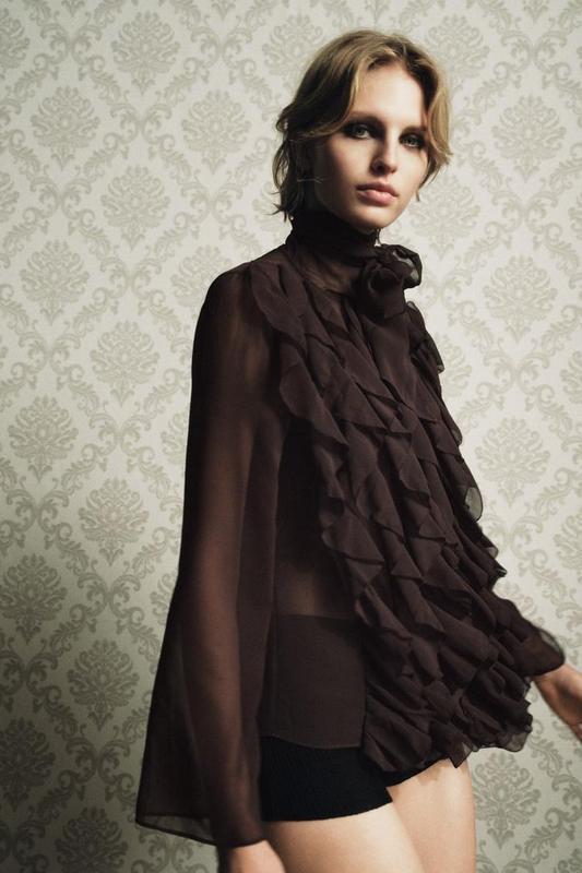 Ціна 2580 Напівпрозора сорочка високого регулюючого кольору з бантом. Довгий рукав. Деталь воланів не з тієї ж тканини. Цей товар не містить внутрішньої підкладки. Коричневий | 3920/902