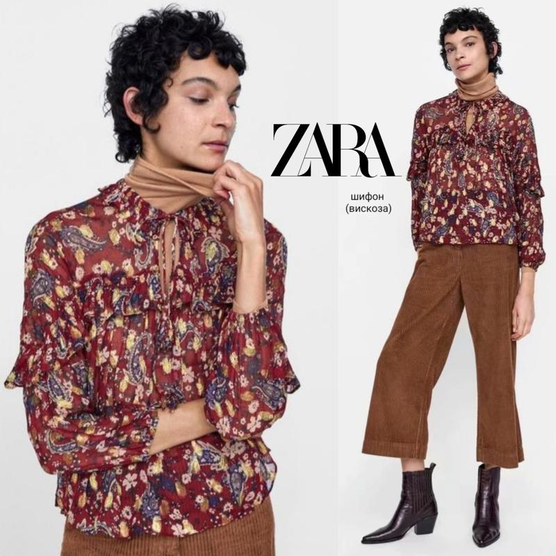 Акция 🎀 1+1=3 🎁 Внимание в магазине действует🎀 Акция 🎀 покупаем 2 вещи выбираем третью которая по цене ниже из двух в подарок 🎁 😀😍 📌📌📌📌📌📌📌📌📌📌📌📌📌📌📌📌📌📌📌📌 Шифонова блуза від Zara, представлена в бордовому кольорі з яскравим візерунком, що містить елементи пейслі та дрібні квіткові мотиви. Модель має оборки вздовж лінії грудей і рукавів, а також зав'язки на комірі, що створюють романтичний акцент. Рукави довгі, з гумкою на манжетах, що додає обсягу та легкості до загального силуету. Розмір від виробника вказаний S за вимірами підійде і на М. Стан новий без паперової бірки. За запитом відправлю детальне відео блузи абож зроблю додаткові фото. Більш детальні заміри відправлю в приват. Відсилання: Новою поштою Укрпоштою 100% оплата на карту приват Безпечна оплата