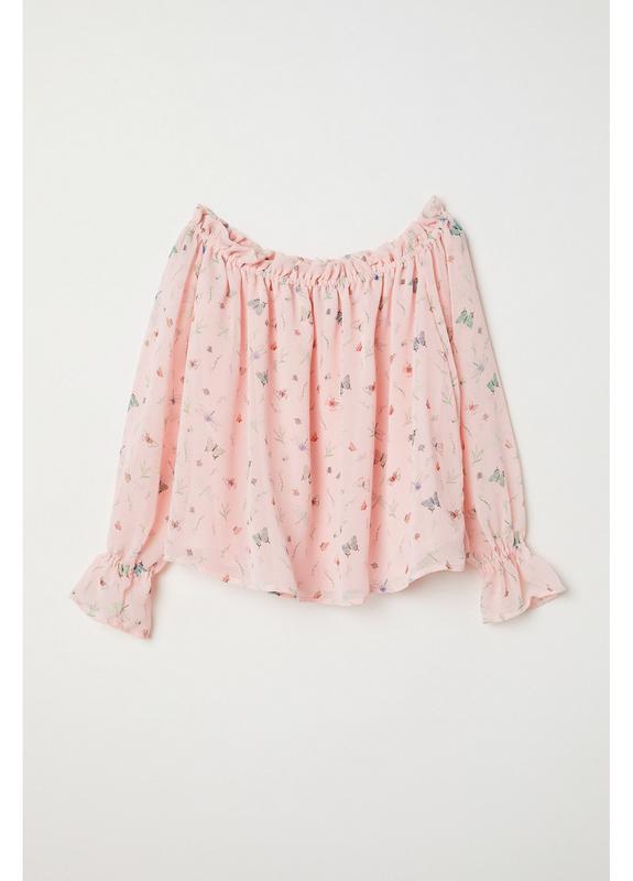 Замеры по изделию: 36 Обхват груди - 96 см Блуза с открытыми плечами из шифона плюмети с резинкой вверху, длинными рукавами с резинкой и воланами на манжетах, а также закругленным низом. Подкладка из джерси. Возможно повреждение бирки 0607705_07