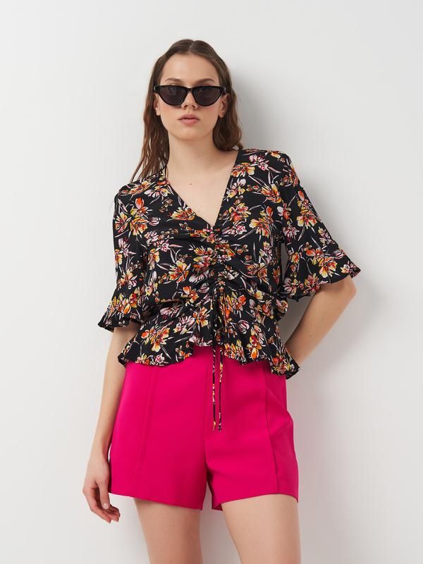 Замеры по изделию: 32 Обхват груди - 82 см 34 Обхват груди - 84 см 38 Обхват груди - 94 см Блуза с короткими рукавами из крепа с воланами на манжетах и V-образным вырезом на кулиске. Асимметричный низ с прикрепленным воланом. Возможно повреждение бирки 0627197_оранж.цв_10