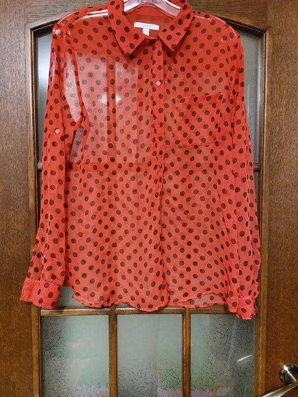 Червона шифонова блуза в чорний горошок від ESPRIT. Рукав підбирається. Спереду нагрудна кишенька. Заміри ШП 44, ширина 60, довжина 70, довжина рукава 65см.