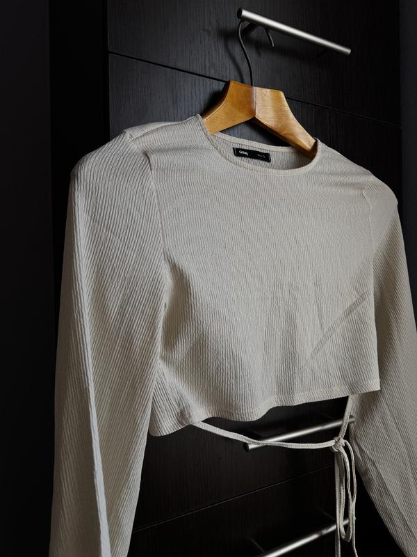 Стильный белый кроп-топ с длинными рукавами. Он имеет классический круглый вырез и текстурированную ткань с легким рельефом. Оригинальной деталью являются длинные завязки на талии, которые можно обматывать вокруг для создания акцента по фигуре. Рукава немного свободные и слегка собранные внизу. Такой топ отлично сочетается с джинсами, юбками или брюками с высокой посадкой. Длина-31 см Рукав-55 см О/г- 31 см