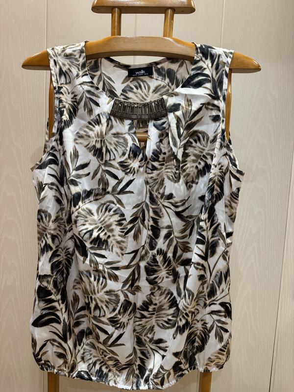 В наявності красива блузка фірми WALLIS. Розмір вказаний 16. Склад: 100% поліестер. НОГ 57-58, довжина-67, плечі — 40, по низу гумка — максімум тягнеться до 67.