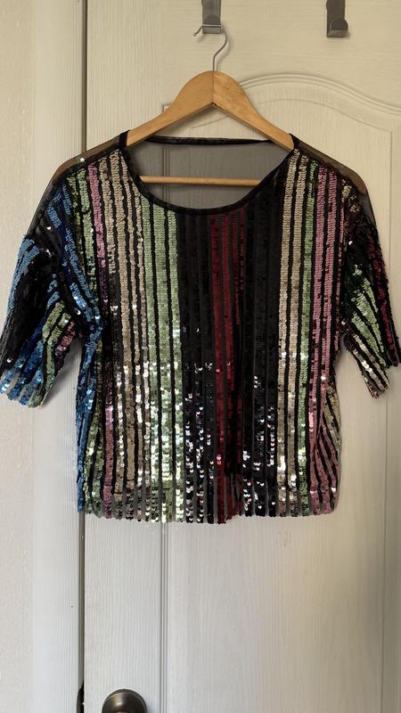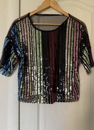 Блуза в паєтки чорного кольору з коротким рукавом. Розмір М (38/46). Нова (без бірки) Довжина 52 см Рукав 20 см ПОГ 51 см Ціна 390 грн
