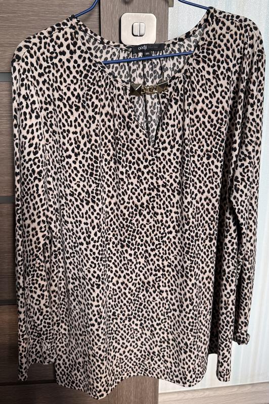 Дуже класна кофтинка в модному леопардовому принті. Тягнеться. Невиблива в догляді, навіть не потребує прасування. Ідеальна на 46-48 розмір.