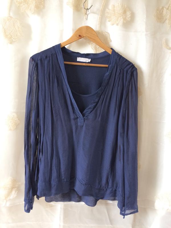 Довжина 65 см, ПОГ тягнеться від 50 до максимального 60 см, НОС 60 см, плечі 45 см, довжина рукава 64 см. Блузка всередині має трикотажну підкладку-майку синю.