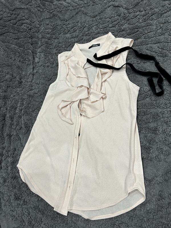 Літня блуза з воланами ніжно рожевого кольору, на шиї має завʼязку