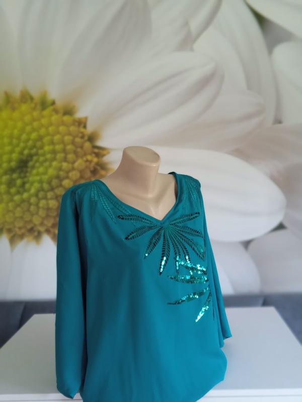 Класична блузочка насичено бірюзового кольору. Прикрашена вишивкою з пайєток. Легка та зручна. Приємна на дотик. Тонка, але щільна тканина. Практично не тягнеться. Лягає вільно, з напуском на резинку по низу. Акуратний виріз. Укорочений рукавчик по лікоть. Є розміри.