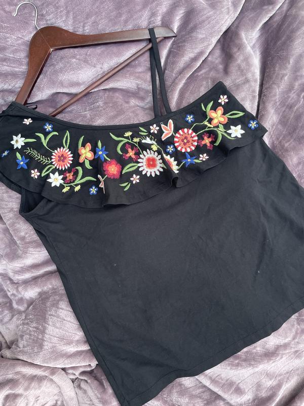 Гарна вишиванка з воланом та відкритим плечем next- s/m. Трикотаж котон. Вишивка квітів дуже гарно виконана. Нова з біркою.