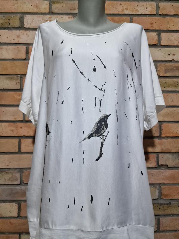 Стильная кофточка, свободного кроя. В реале очень красиво смотрится. Хлопок+вискоза, немножко тянется. Спинка трикотаж, перед ткань типа "искусственный шелк". Новая (без бирки) есть небольшая зацепка. Размер около 58/60 ориентируйтесь на замеры. длина 81/71 ОГ 146 ОТ 138 ОС 134