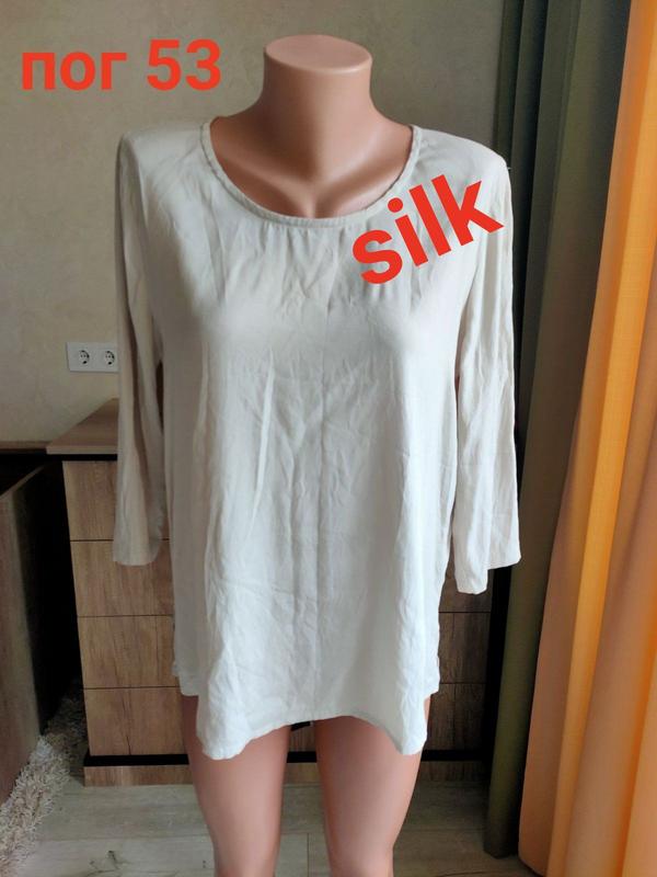 В дуже гарному стані ♥️♥️♥️♥️ по бірці 42 розмір. Натуральний шовк 94/ + еластан . Надзвичайно!!!! приємна до тіла . Прямо класнюча по відчуттях буде👍👍👍🌹🌹🌹Можна брати як базову річ 🌹🌹🌹 Пог 53_54, довжина рукава 45 см, по спинці довжина 65 см, ширина виробу в самому низу 56 см, збоку є маленькі розрізи. За рахунок еластану чуть тягнеться.