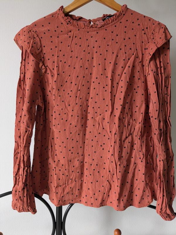 блуза без дефектів, по бірці вказано розмір L, але вона маломірить, тому орієнтуйтесь також на заміри тканина трошки тягнеться і не просвічується ЗАМІРИ довжина 60 напівобхват грудей 50 напівобхват в поясі 48 напівобхват в самому низу 53 довжина рукава 59 довжина рукава по внутрішньому шву 37 напівобхват рукава в самому широкому місці 17.5 плечі 38