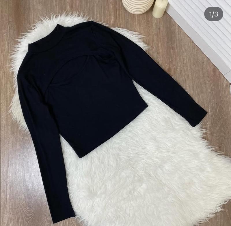 Укорочений лонгслів лонг чорний в рубчик з крутим декольте розмір 10