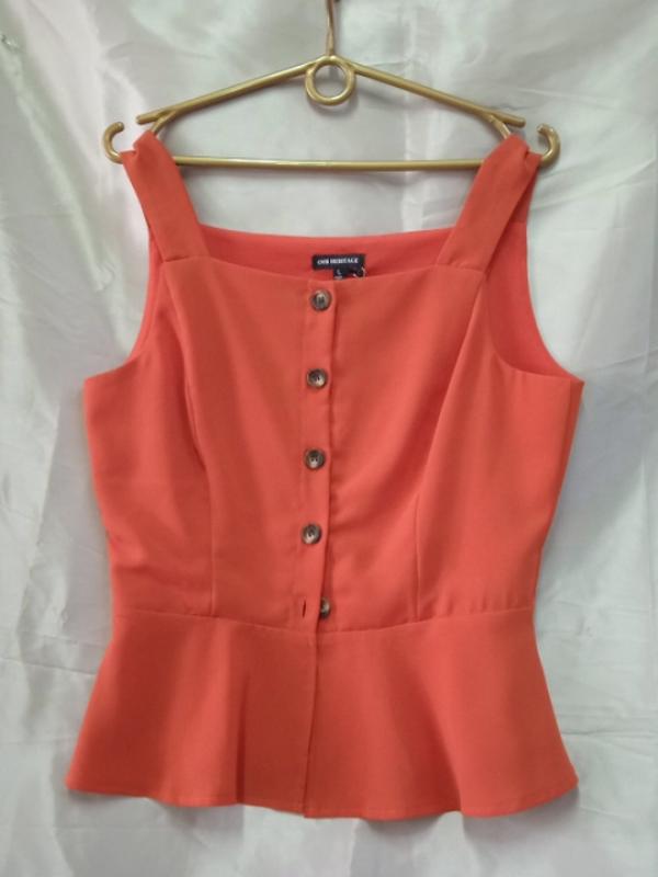 Жіноча блузка-топ на гудзиках (розщіпаються), р.L. На тонкій підкладці, приталена. Ширина по грудях 49-51см, ширина по талії 38-39см, довжина по боковому шву 33,5см, довжина по центру спинки 46,6см, довжина по бретелі до низу 56см.
