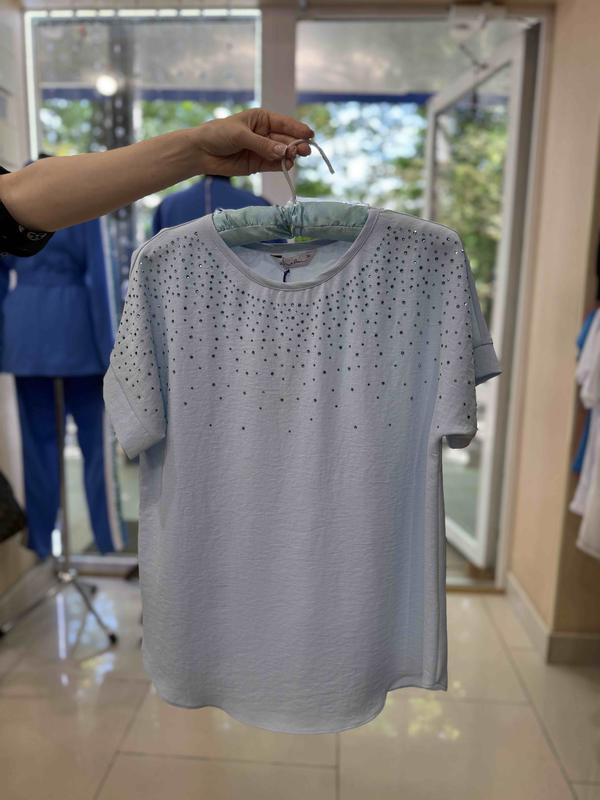 Блуза женская голубая летняя нарядная со стразами с коротким рукавом