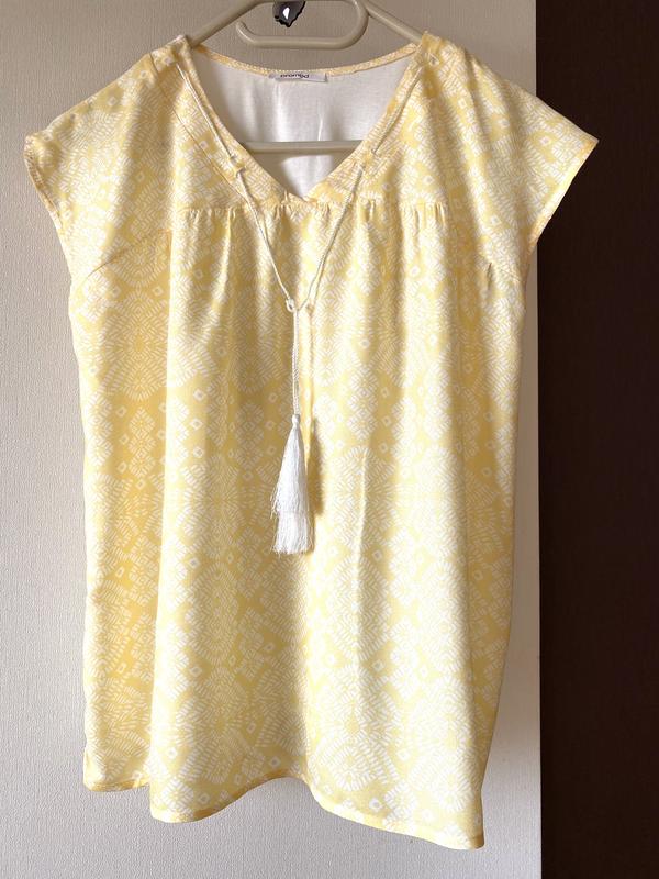 Неймовірно легенька, майже невагома блузочка з тонкої віскози. Спереду прикрашена шовковистим шнурочком з китицями. Спинка трикотаж. Плечі спущені Напівоб’єм грудей 51 Напівоб’єм талії 55 Напівоб’єм стегон 59 Довжина вироба 63 Плечі 52 Довжина плеча 17