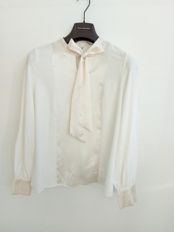 Блуза фірмова молочного кольору з атласними вставками. Довжина 63, плечі 38, ПОГ 47 ( крій прямий), рукав 61