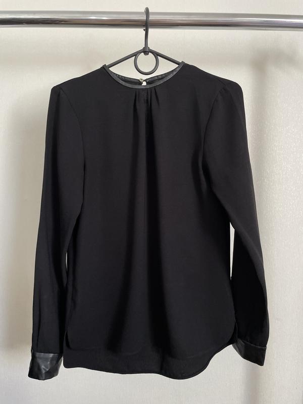 Елегантна жіноча блузка чорного кольору з довгими рукавами. Колір: суцільно чорний. Комірець: круглий, оздоблений тонкою шкіряною вставкою, що додає елегантності. Деталі: невелика складка або драпірування спереду під комірцем, яка створює м’який об’єм. Манжети: рукави закінчуються манжетами з таким самим оздобленням, як і комірець — з глянцевого матеріалу, з ґудзиками. Застібка: ззаду під комірцем видно ґудзик для застібання.