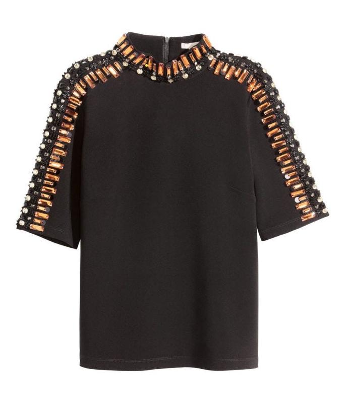 Святковий топ з помаранчевими, чорними та срібними коштовностями.