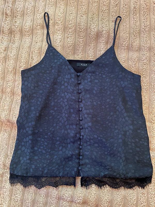 Блуза VILA Колір: темно-синій з ніжним леопардовим принтом Матеріал: приємна до тіла тканина, низ декорований мереживом Застібка: декоративні гудзики спереду Стан: відмінний, без дефектів Ідеально пасує як до повсякденного, так і до вечірнього образу