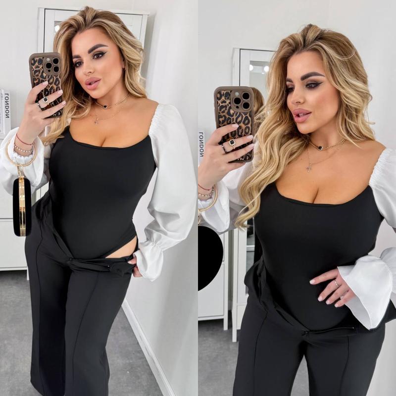 Боді-блузка з пишними котоновими рукавами – створена, щоб додати легкості, витонченості та нотки романтики у ваш образ 💕 Об’ємні рукави з м’якого котону надають елегантності й ніжності 🌸 Модель: 395 Розміри: 48-52, 54-58 Колір: 🖤 чорний Параметри: • 48-52 – ОГ до 115 см • 54-58 – ОГ до 135 см Довжина рукава: 62 см Тканина: віскоза + котон Ідеально поєднується як з класичними штанами, так і з джинсами – для будь-якого настрою та події!
