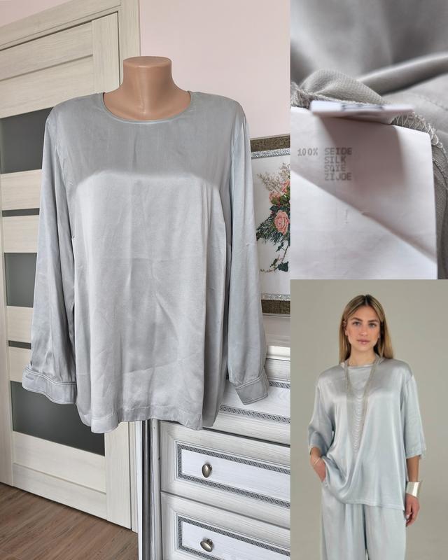 Вишукана блуза з натурального якісного в міру щільного блискучого гладкого шовку, розмір 48, за рахунок не великого вирізу гарно сяде і на менший розмір заміри довжина 70 плечі 45 рукав 57 пог 62