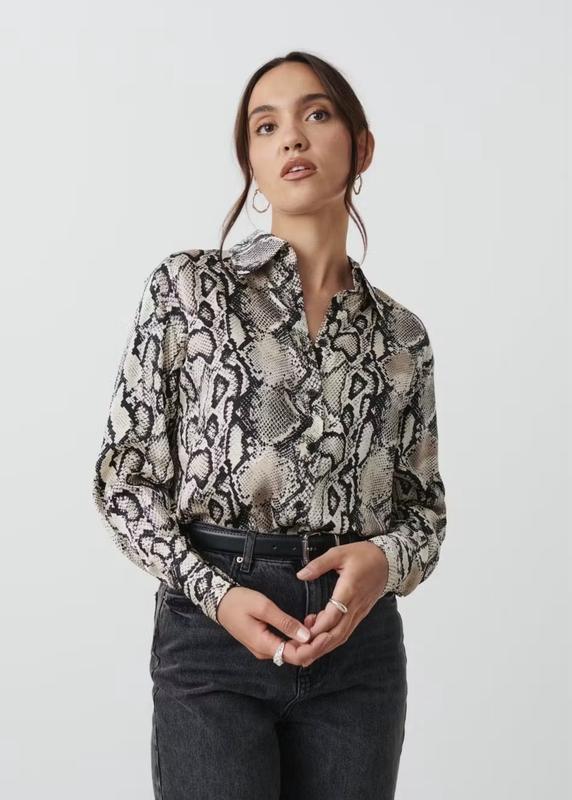 Блузка в зміїний принт. На талії- завʼязка, але можна і без неї.