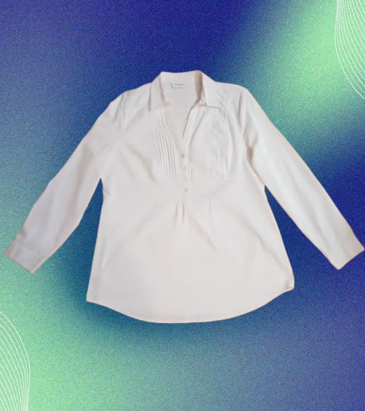 Классическая белая блузка с длинным рукавом – универсальная вещь в вашем гардеробе. Идеально подходит как для работы, так и для повседневных образов. Легкая ткань, приятная к телу, с элегантными защипами и пуговицами спереди. 📌 Длина: 77см 📌 Состояние: отличный 📌 Цвет: белый (подходит ко всему!) 📌 Состав: хлопок 👌 Сочетайте с джинсами для casual-стиля или с юбкой/брюками для офисного look’а.