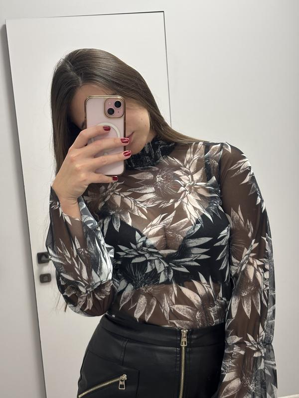 Блуза напівпрозора, дуже цікаво і стильної виглядає, рукавчики розширюються до низу. Стан нові речі, проте є один дефект ( передостаннє фото), фарба на рукаві, проте при носці абсолютно не видно її.