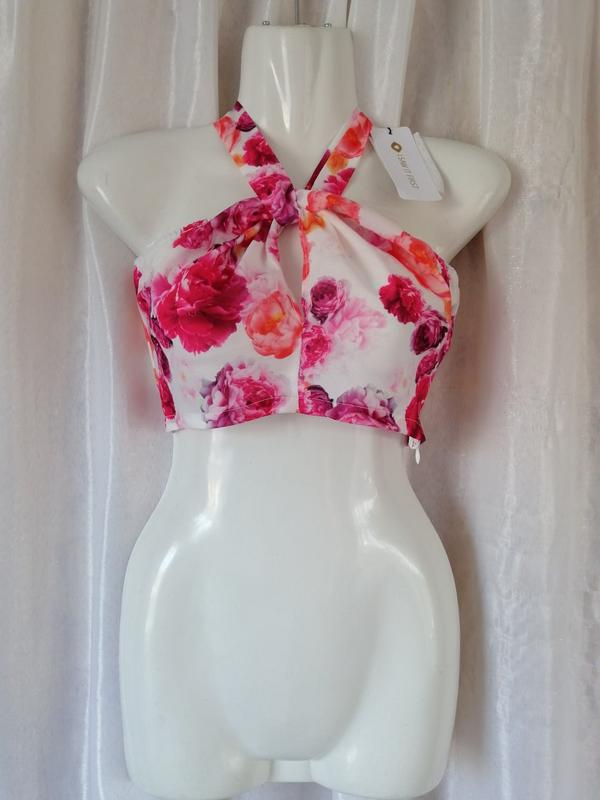 топ блузка цветочный Принт завязка через шею застегивается на молнию сбоку - молния скрытая размер S полуобхват груди 40 см тянется на 43 см высота полотна топа 16 см завязки которые вокруг шеи очень длинные делать переплёт можно сзади или спереди допускаю погрешность в измерениях плюс-минус 1 см
