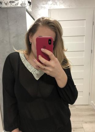 Чорна прозора шт фонова блузка, підійде як і до ошатного так і до будьонного стилю. Оздоблений воротнік камінчиками. Низ рукава та на резиночці