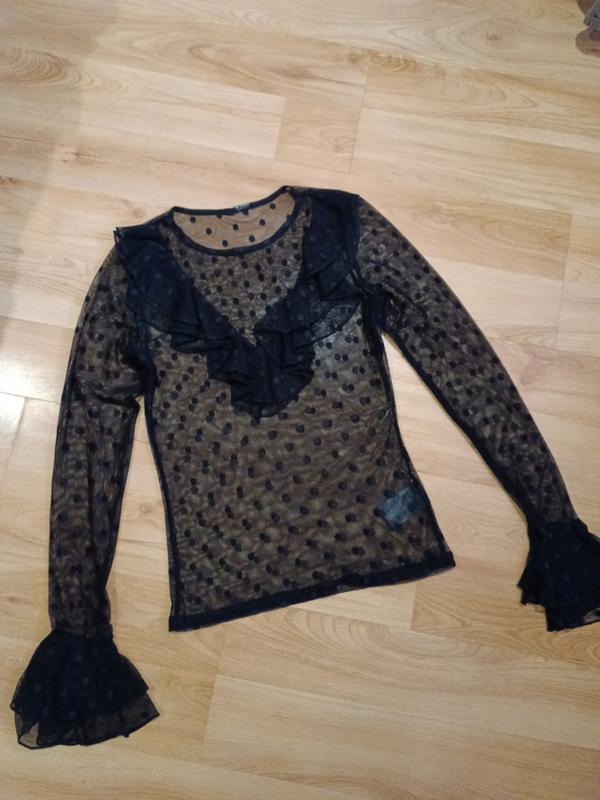 Нарядка , дуже цікава кофточка. На грудях йде рюша, рукава розклєшоні . Тканина сіточка, дуже приємно, трішки тягнеться. Стан нової. Підійде на розмір хс