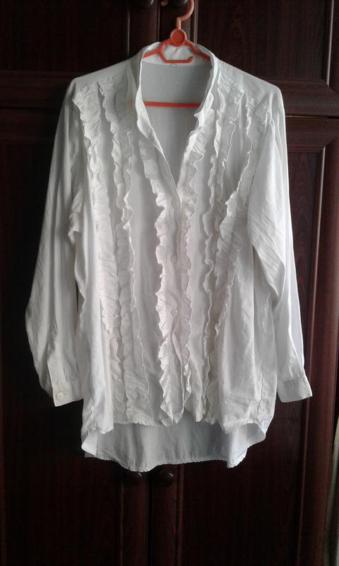 Біла блузка з рюшами.Батал. Склад тканини: 60% віскоза 40% поліестер. Комір-стійка. Перерізна застібка на планку.Підвдовжки заокруглений. Спинка довша переду.Розмір вказаний М, але, насправді, набагато.Орієнтуйтеся на заміри, пошкодуйста. Заміри: Ширина Плеч- 46 ПОГ- 69,5 НОТ- 69 Довжина спинка — 85 Довжина перед -76 Довжина рукава-59.