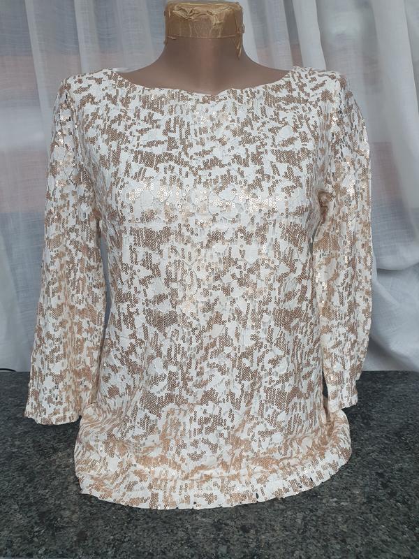 Золотистий топ з паєтками та чвертьрукавами Розмір M Заміри: Довжина-62 Ширина під пахвами-46 рукав-46