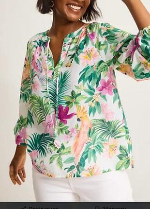 яскрава блуза із віскози.виробник Італія.. матеріал приємний, не міняє колір, має гарний тропічний принт.рукав можна підкоротити. груди -54 рукав -58 довжина -64
