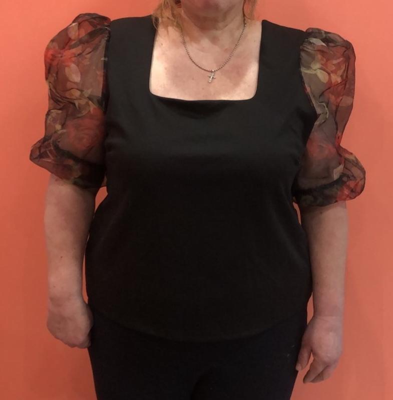 ,Блуза из плотного трикотажная, прозрачные рукава буфы из органзы.Верхня часть двойная. Мне кажется, что она маломерит на свой размер.Груды 130,стена 140, длина 66 см