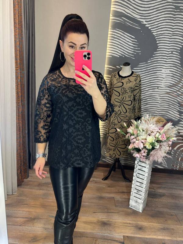 невероятно красивая кофточка прямого кроя с круглым вырезом и рукавами 3/4, идеально подойдет вам для торжественных мероприятий, семейных торжеств и новогодних корпоративов, она изготовлена из черной полупрозрачной сетки на подкладке, декорированной утонченной узором из экокожи размеры 50, 52, 54, 56, 58, 60 длина 67-68 см, объем груди по изделию 108-130 см, длина рукава 55-56 см код S 8583G