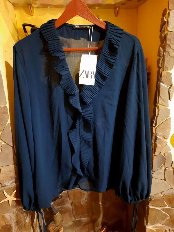 Блузка із шифону з плісируванням і оборками zara темно-синя раз xl, пог —55 см