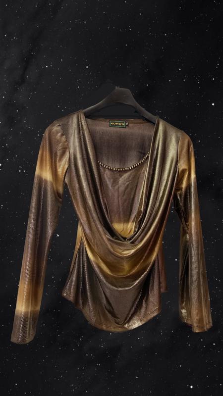 Розкішна блуза з ефектним металізованим сяйвом у золотисто-бронзових відтінках ✨ М’яка, еластична тканина красиво переливається та ідеально драпірується, підкреслюючи фігуру. Глибокий драпірований виріз додає образу жіночності та елегантної спокусливості, а довгі рукави створюють вишуканий баланс. Блуза чудово підійде для вечірніх виходів, свят, фотосесій або стильних подій. Легко комбінується зі спідницями, штанами чи джинсами, додаючи образу «вау»-ефект без зайвих аксесуарів. Стан: відмінний Посадка: підкреслює силует Стиль: гламур, вечірній, fashion Ідеальний вибір для тих, хто любить бути в центрі уваги 💫 🌱колір: бронзовий 🌱розмір: пише XL, але маломірить більше йде на S/M Заміри уточнюйте