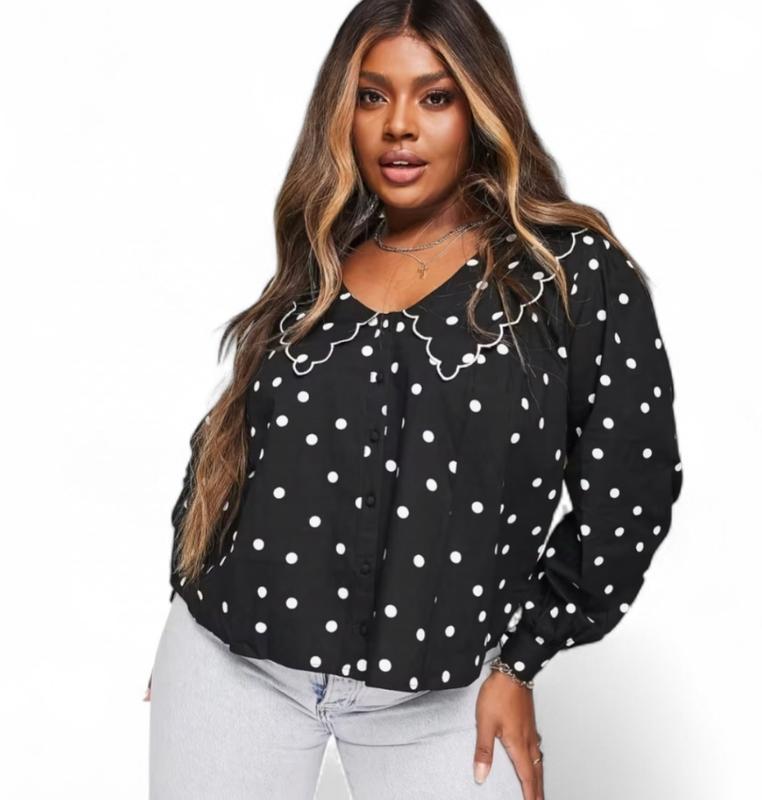 Блузка Influence Plus з коміром у горошок розмір вказано 20.Пог 68 см , плечи 43 см , рукав 64 см , длина по середине спинки 61 см