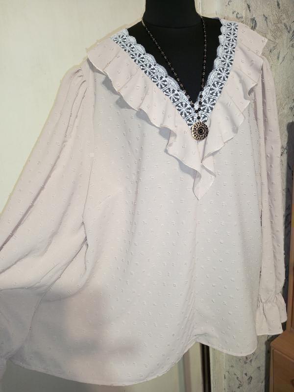 Жіночна, ошатна, пудрова -беж-крем, фактурна блузка-трапеція з білим мереживом та оборкою по декольте , з об'ємним рукавом та манжетом, мега батал, SHEIN. Розмір 3XL, але орієнтуйтеся за вимірами: ПОГ від пахви до пахви - 68/70см + є виточки; ПОС, по канту - 74/76см, довжина від плеча- 70см, довжина рукава - 65см, ПО біцепса -25/27см Одягнена пару разів, гарна, чудова річ. Дівчата, будь ласка, перепитуйте - зроблю додаткові фото і заміри. Повернення немає - оголошення платні. Див.інші оголошення - є аналогічні блузки, штани, піджаки ...,а також 90% одягу великого розміру. Підписуйтесь - щоденні оновлення одягом великих розмірів не тільки. Купуючи кілька товарів - Ви економите на пересилці, лоти комбінуються. Перед покупкою -прохання: ознайомитися з рубрикою "ПРО МЕНЕ" Склад: поліестер Доставка: Перешлю в ін. міста за Ваш рахунок - при повній оплаті на картку