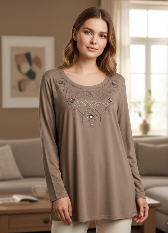 Жіноча кофта — стильна та елегантна модель з довгими рукавами і округлим вирізом. На передній частині розташовані декоративні елементи: металеві заклепки та симетричний візерунок зі стразів, що утворюють геометричні форми — ромби та квадрати. Тканина м’яко драпірується, створюючи комфортний силует, а довжина виробу прикриває стегна. Дефектів немає. ВИМІРИ: 🦚 ДОВЖИНА: 72-75 СМ 🦚 ВІД ПЛЕЧА ДО ПЛЕЧА: 42 СМ 🦚 ДЛ.РУКАВА: 59 СМ 🦚 ГРУДИ ПОВНА ШИРИНА: 112 СМ 🦚 ТАЛІЯ ПОВНА ШИРИНА: 108 СМ ТЯГНЕТСЯ 🦚 ПО НІЗУ ПОВНА ШИРИНА: 124 СМ ТЯГНЕТСЯ