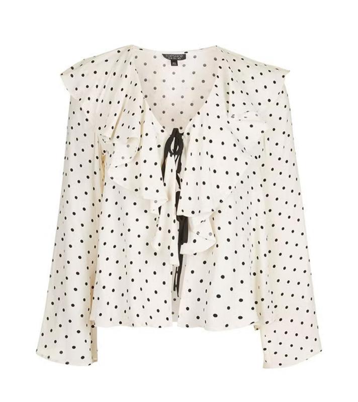 блуза в горох з широки рукавами, молочна в чорний дрібних горох, на чорних зав'язках на хс с Плечі 38 Рукав 56/42 Пог 44 Довжина 56