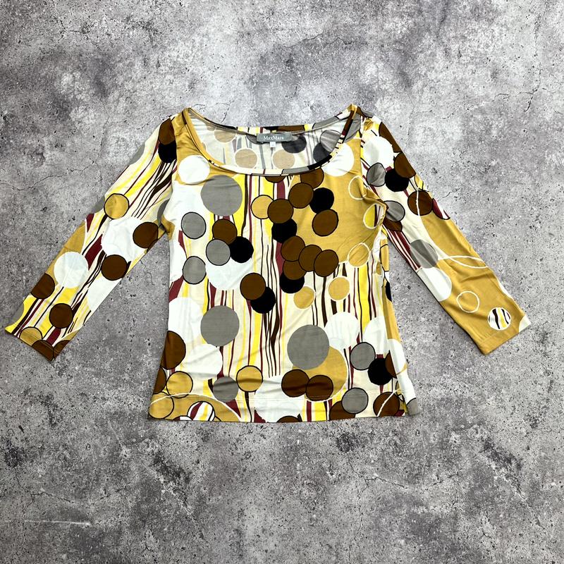 Довжина 52 Напівобхват 44 Плечі 37 Рукав 46 Розмір М Фасон: приталений топ / лонгслів Горловина: кругла (scoop neck) Рукав: 3/4 (три чверті) Матеріал: м’який еластичний джерсі – 90% віскоза, 10% еластан (див. ярлик на фото) Колір: мікс гірчичного, білого, сірого, коричневого, чорного з вертикальними лініями та кругами. Топ приємний до тіла, добре тягнеться і красиво облягає фігуру. Ідеально під піджак, кардиган чи самостійно – для офісу, прогулянок або smart‑casual образів.