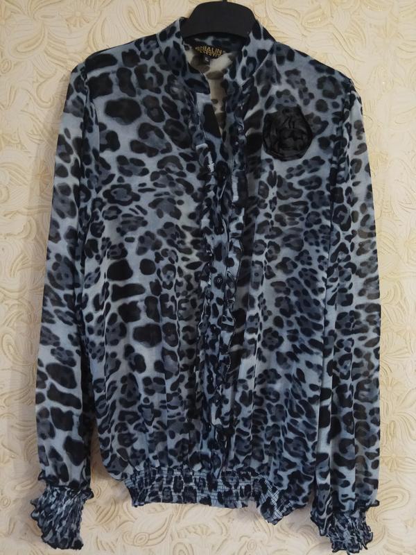 Трендова шифонова блуза, Туреччина, р-р. 48-50.,в актуальний леопардовий принт в синьо-сіро-чорному кольорі,застібається на гудзиках, з v-подібним вирізом, комір стійка.Низ блузону і рукавів на гумці.Приємної якості.Річ нова. Заміри: плечі 35 см., рукав 65 см., об.грудей 53 см., низ блузки 52 см., довжина виробу 60 см.(перед),63 см (зад). Перешлю після 100% оплати на картку. відправлю Новою або Укр.поштою. За більш детальною інформацією звертайтесь. Дивіться мої інші оголошення.