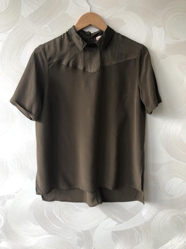 Блузочка з розрізами з боків . Застібається на три ґудзики. Стан дуже хороший. Розмір 38. Довжина 67 і 64 см по спинці довгий, пог 51 см, плечі 37 см