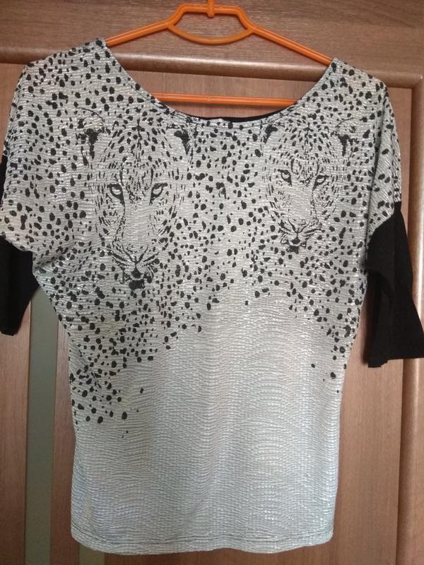 Розмір 46-48. Бірка відрізана. Заміри :ПОГ 47-48 см, довжина по спинці від плеча 56.Ззаду чорний тонкий трикотаж, спереду тканина поліестер срібляста, рукав мені до ліктя.
