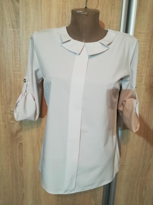 Біла офісна блузка. Розмір 44. Рукав можна регулювати(на фото видно правий і лівий) Невеличкий дефект(на фото видно) стрілка, яка практично не помітна. Довжина від плеча 63-65см. Довжина рукава(відкритого) від плеча 42см.