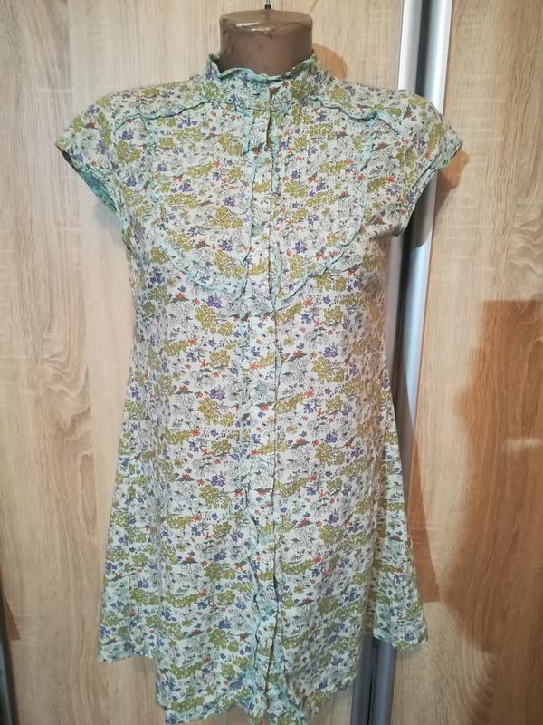 Тоненька м"яка блузочка. З стійкою та невеличкими рукавами. Розмір L. Довжина від плеча 76см Обхват грудей 45см.